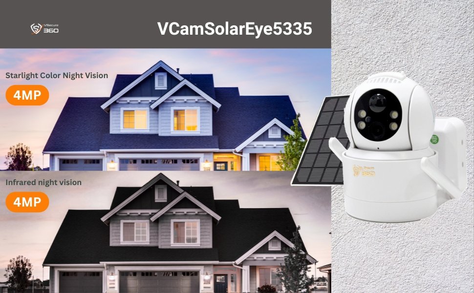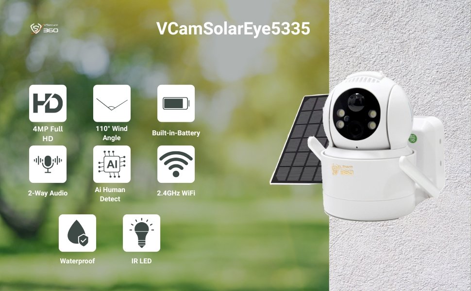 The VCamSolarEye5335 uses PIR motion detection to instantly record and alert you on your phone. It provides 24/7 protection, effectively deters intruders, and keeps you updated on every movement with its full color LEDs, flashlight, siren alarm, and app notifications.