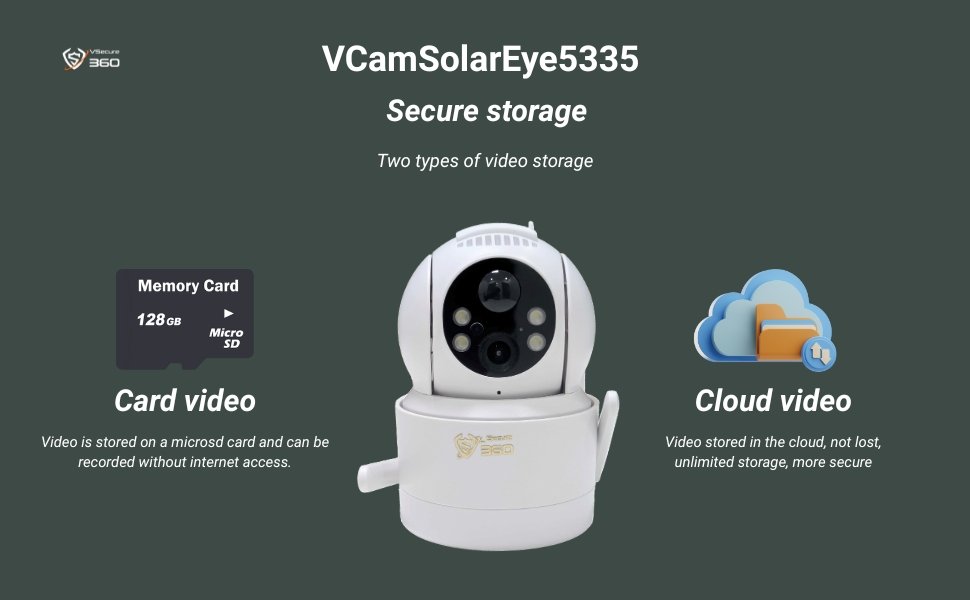The VCamSolarEye5335 provides two reliable ways to safeguard your recordings. Store video locally on a Micro SD card (up to 128GB) for offline access, or back up footage instantly to the cloud for unlimited, secure storage that’s never lost ensuring peace of mind at all times.