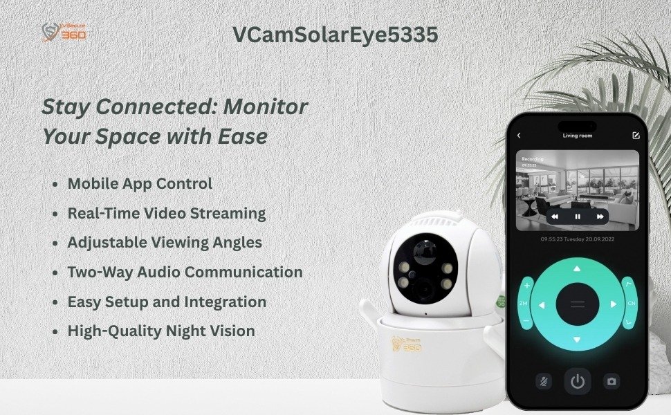 The VCamSolarEye5335 ensures effortless monitoring with mobile app control, real time video streaming, and adjustable viewing angles. Featuring two way audio communication, easy setup, and high-quality night vision, it keeps your space secure and accessible, day or night.