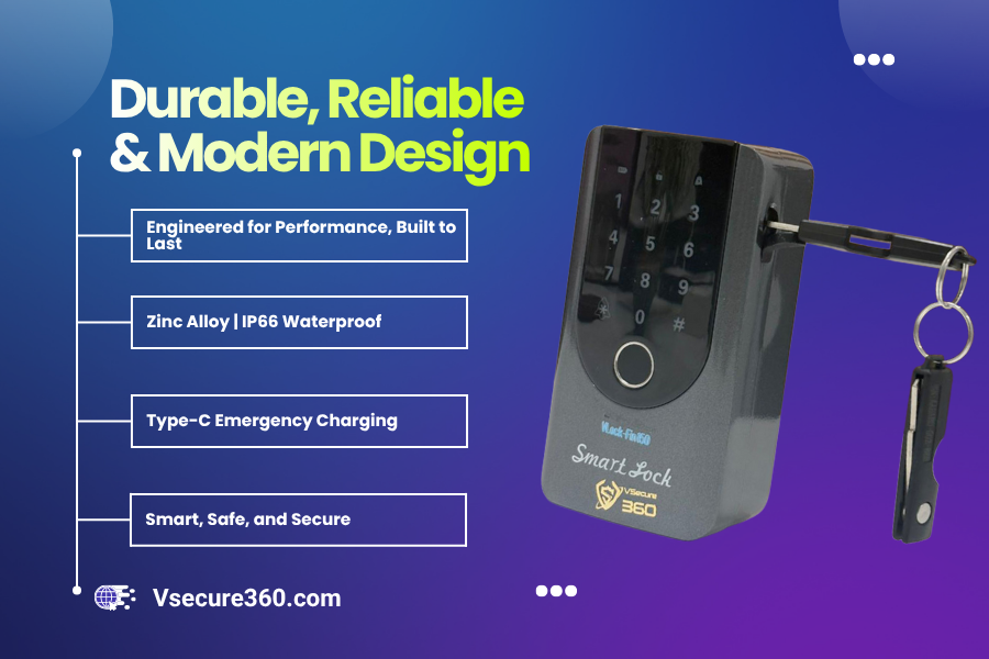 Built to withstand the elements, the zinc alloy body ensures long-lasting strength. With IP66 waterproof protection, a Type-C emergency charging port, low battery alerts, and false alarm protection, the VLock-Fin150 delivers dependable performance with a sleek modern finish.