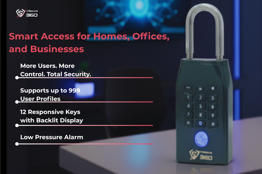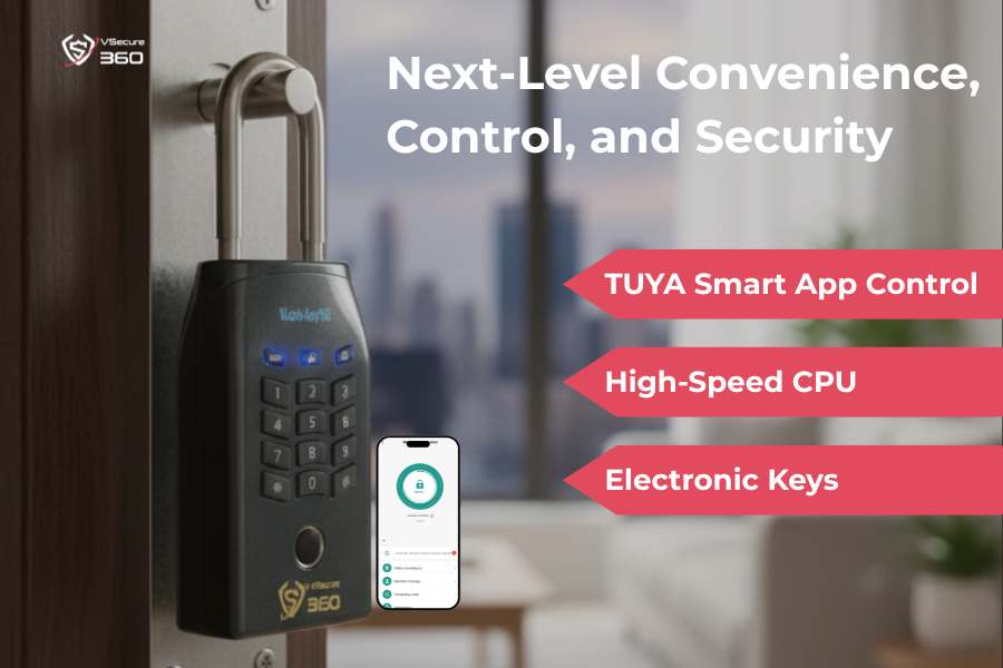 Experience next-level security and convenience with the VSecure360 Smart Key Box. Powered by a high-speed CPU and a vibrant OLED display, it supports Fingerprint, IC card, password and electronic keys authentication for ultimate access flexibility. Manage and monitor remotely through the TUYA Smart App for real time control and updates. It is perfect for home, office, and commercial use because it has 12 keys and can store up to 120 fingerprints and 999 user profiles. Built with a durable plastic front shell and iron plate back, it combines reliability, modern design and intelligent access management in one sleek unit.
